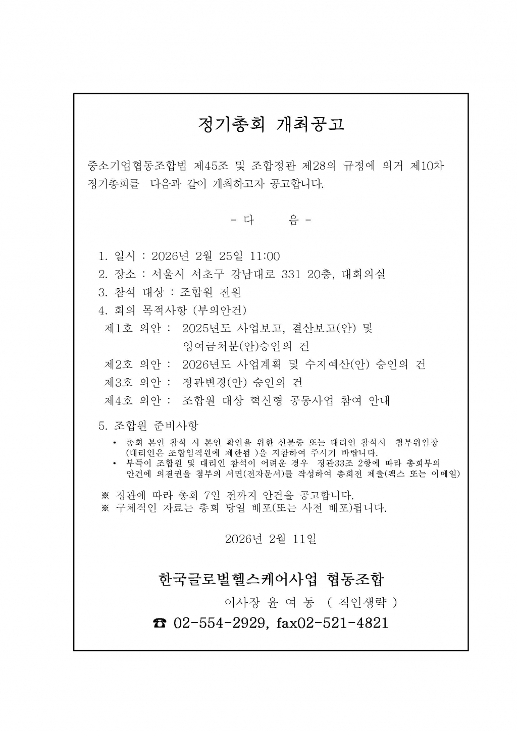 KOGHA 제10차 조합원 정기총회 개최 안내